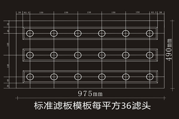 ? A型模板長(zhǎng)×寬×高(975×490mm×55mm),厚度3.0mm,誤差0.2mm;可安裝濾頭數(shù)量18個(gè)/塊和21個(gè)/塊。相當(dāng)于36個(gè)濾頭/㎡(縱向間距150mm,橫向間距140mm),42個(gè)個(gè)濾頭/㎡(縱向間距130mm,橫向間距160mm)濾梁中心間距1000-1060mm。
