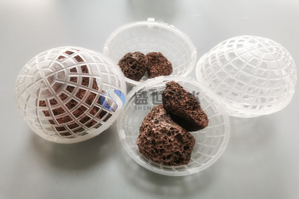 該填料多孔球型懸浮填料中有聚乙烯材料制造而成,分內(nèi)外雙層球體外部為中空魚網(wǎng)狀球體,內(nèi)部為轉(zhuǎn)型球體,在使用過程中,微生物易生長、易更換、耐酸堿、抗老化、不受水流影響、使用壽命長,剩余污泥少,安裝方便。