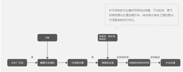 針對(duì)這些難點(diǎn),盛世環(huán)保推出了“新型污泥深度脫水處理系統(tǒng)”。系統(tǒng)由濃縮、調(diào)理、脫水技術(shù)路線組成。