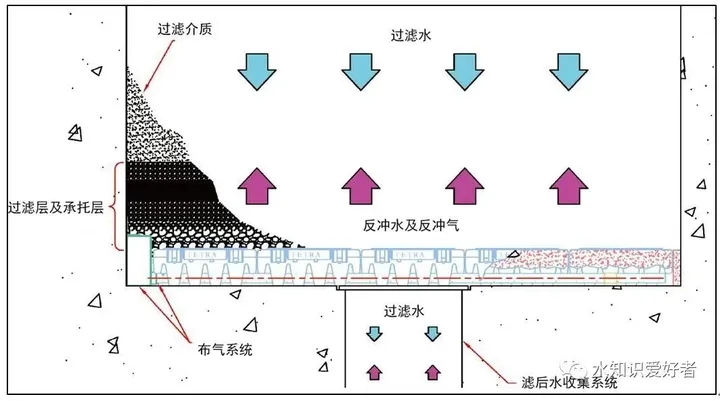 Tetra經(jīng)過多年的研究發(fā)現(xiàn):濾料層建議為石英砂,粒徑2-3mm,不均勻系數(shù)一般1.35,厚度6英尺,對應(yīng)1.83m,也即污染物的穿透深度;承托層建議為18英寸的分級卵石,對應(yīng)0.45m,粒徑分布范圍為3-40mm,采用3~4種規(guī)格5層配礫石分布方式,每層厚度宜為90mm,總厚度宜為450mm。通常認為,當去除TN為5mg/L采用6英尺即1.83m的濾料層厚度,當去除TN為10mg/L時,增加濾料層厚度至8英尺即2.44m的濾料層厚度。根據(jù)研究,具有高均一性系數(shù)的相對球形濾料更易于滾動和接觸,從而形成更有效的反沖洗及氮氣釋放效果,并終減少反沖洗水量的要求。反硝化砂濾池沖洗前水頭損失可采用2.0-2.4m,一般選2.0m,當然如果選擇值過小,那么沖洗頻率就會過大。濾池超高一般選擇0.6-1.0m。這樣算下來濾池深度一般在6.0m左右。